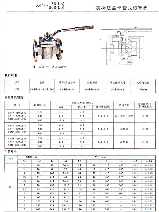 X41F美標法蘭卡套式旋塞閥, 主要性能規(guī)范