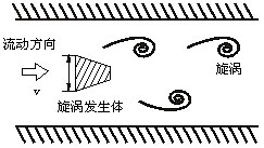 在測(cè)量管中垂直插入一個(gè)柱狀物時(shí),流體通過柱狀物兩側(cè)就交替地產(chǎn)生有規(guī)則的旋渦(如圖所示),這種旋渦列被稱為卡門渦街?ㄩT渦街的釋放頻率與流體的流動(dòng)速度及柱狀物的寬度有關(guān),可用下式表示: |