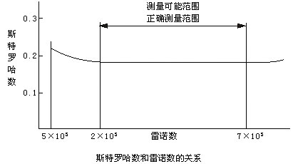 卡門渦街釋放頻率f和流速v成正比,因此通過測(cè)量卡門渦街釋放頻率就可算出瞬時(shí)流量。斯特羅哈數(shù)是渦街流量計(jì)的重要系數(shù)。在曲線的St≈0.17的平直部分,旋渦的釋放頻率與流速成正比,所以檢出頻率f就可求得流速v,由v求出體積流量。 |