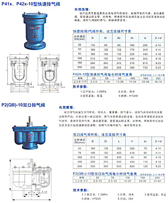 c65bP41X、P42X、P2(QB)快速排氣閥/雙口排氣閥誕生于70年代,體形大,重量重,排氣量小,該排氣閥在80年代末為理想產(chǎn)品,問世以來(lái)一直還續(xù)用。排氣閥是管道必配設(shè)備,安裝在管道高點(diǎn)或閉氣地方,來(lái)排除管內(nèi)氣體,來(lái)疏通管道,使管道運(yùn)轉(zhuǎn)正常,保證排氣時(shí)絕不排水.只要系統(tǒng)有壓力,排氣閥就會(huì)連續(xù)不斷的排氣