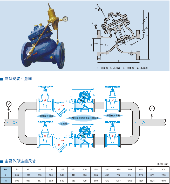 YX741X隔膜可調(diào)式減壓穩(wěn)壓閥是暗安裝于高層建筑給排水系統(tǒng)管道上,將進口壓力減至某一需要的出口壓力的特種閥門。該閥門依靠本身能量使出口壓力保持穩(wěn)定在設(shè)定直,即出口壓力不因進口壓力及流量的變化而變化,并且閥門控制系統(tǒng)的進口處裝有一個自清潔濾網(wǎng),利用流體特性,使比重較大、直徑較大的懸浮顆粒不會進入控制系統(tǒng),確保系統(tǒng)循環(huán)暢通無阻,使用門能安全可靠地運行。系統(tǒng)動作靈敏,使用壽命長。