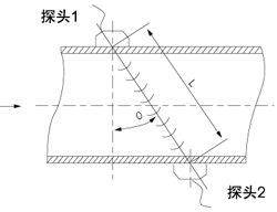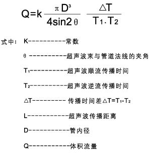 當(dāng)超聲波在液體中傳播時,探頭1發(fā)射的超聲波脈沖被探頭2所接收,同時,探頭2也發(fā)射超聲脈沖,探頭1接收,則順流方向聲波傳播速度會增大,逆流方向則減小,同一傳播距離就有不同的傳播時間,利用傳播時間之差與被測流速之關(guān)系求取流速,進(jìn)而得出流量,其關(guān)系式如下: |