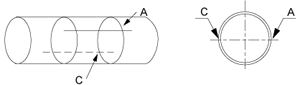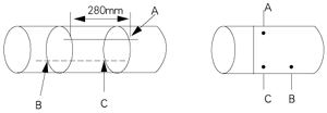 | 從A點(diǎn)開始,沿著定位紙邊邊緣量出管道1/2周長,該點(diǎn)為C,在C點(diǎn)劃一條與定位紙邊緣垂直的直線; |