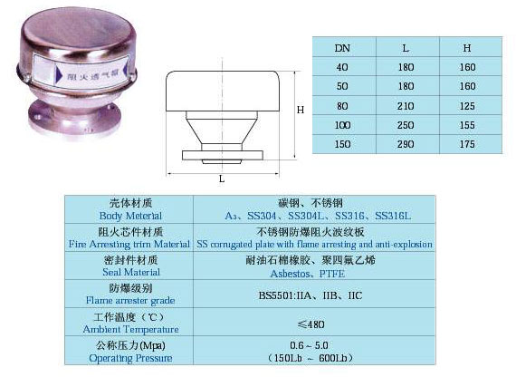 產(chǎn)品描述: 一般裝在罐頂部起阻火通氣作用,其防爆性能在連續(xù)13次試驗過程中每次都能阻火;經(jīng)耐燒一小時,無回火現(xiàn)象,防爆罩具有開啟靈活的特點;當(dāng)罐內(nèi)壓力急劇升高時,防爆桿折斷,大量氣體排出起到保護(hù)設(shè)備的作用, 有法蘭連接和絲扣連接兩種形式,請用戶指明選用要求。