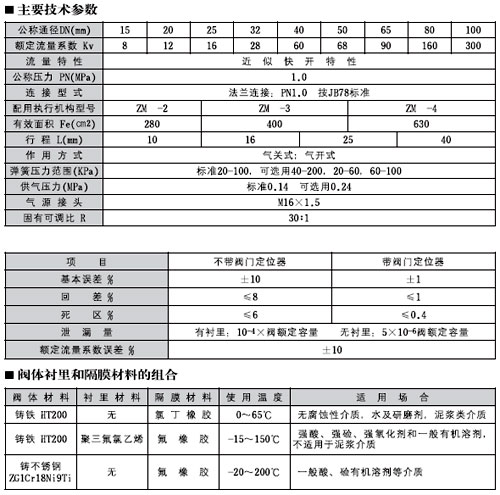 ZMA(B)T一10氣動(dòng)薄膜隔膜調(diào)節(jié)閥為無(wú)填料函結(jié)構(gòu)、節(jié)流元件為彈性隔膜,閥體流道平滑;閥體襯里和隔膜均可采用耐腐蝕材料制造,適用于控制各種腐蝕性和懸浮液介質(zhì)的調(diào)節(jié)場(chǎng)合。