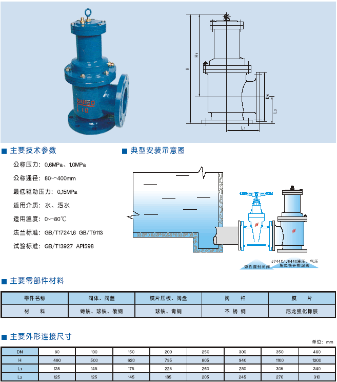 J744X/J644X液壓、氣動(dòng)角式快開排泥閥,是一種由液壓源或氣動(dòng)源作執(zhí)行的角型截止門。通常成排安裝在沉定池底部外側(cè)壁,用以排除池底沉淀的泥砂和污物。該閥液壓缸之活塞為L(zhǎng)形皮碗,密封性能好,經(jīng)久耐用,閥門密封副亦橡膠密封,無泄漏。還可通過電動(dòng)二位四通換向電磁閥實(shí)現(xiàn)遠(yuǎn)程控制。操作方便,安全可靠。
